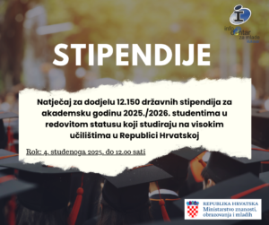 NATJEČAJ za dodjelu 12.150 državnih stipendija za akademsku godinu 2025./2026. studentima u redovitom statusu koji studiraju na visokim učilištima u Republici Hrvatskoj