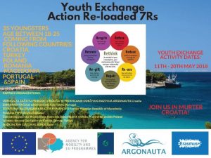 Udruga Argonauta traži četiri sudionika za hrvatski tim razmjene mladih pod nazivom "Action Re-loaded - 7Rs" na temu odgovornog postupanja s otpadom (reciklaža, ponovna upotreba, smanjenje potrošnje, popravci....) Razmjena će se održati od 11. do 20. svibnja 2018. u Murteru...