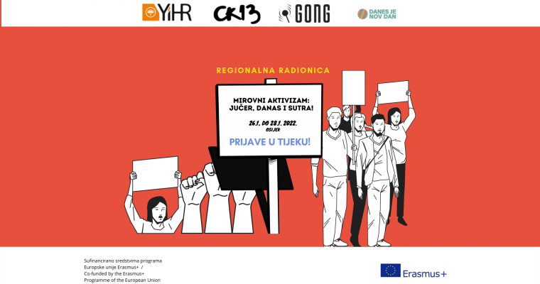 Inicijativa mladih za ljudska prava, Omladinski centar CK13, Gong, Danes je nov dan i DKolektiv pozivaju vas na regionalnu radionicu MIROVNI AKTIVIZAM: JUČER, DANAS I SUTRA koja će se održati od 26. do 28.1.2022. u Osijeku za polaznike i polaznice iz Hrvatske, Slovenije i Srbije.